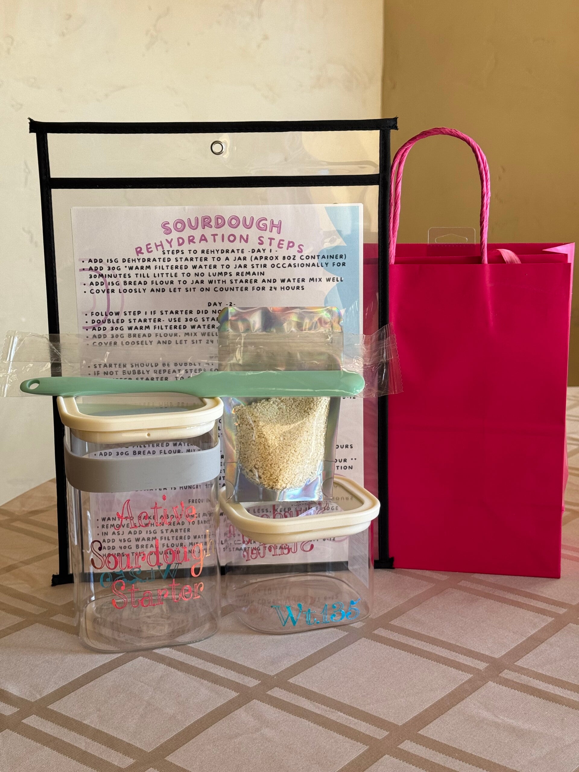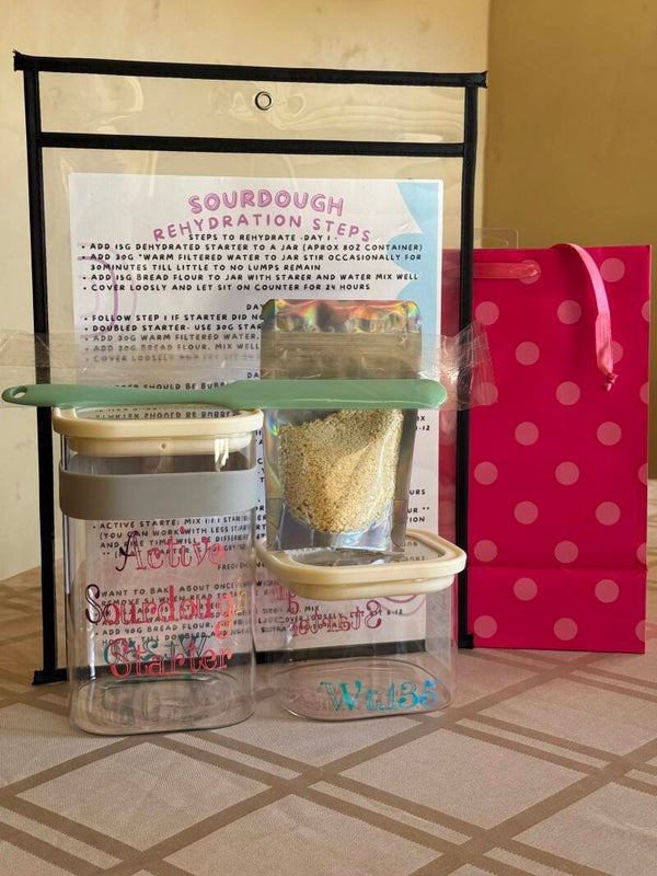 A lovley gift for yourself or someone just starting thier sourdough journey. Wheather you are wanting dyhydrated starter or a kit with glass stater and active starter containes growth band rubber spatula and directions for re-hydration of starter and bread recipies 1- Plain, 1- Molasses Honey Brown Bread (like Cheesecake Factory's bread).